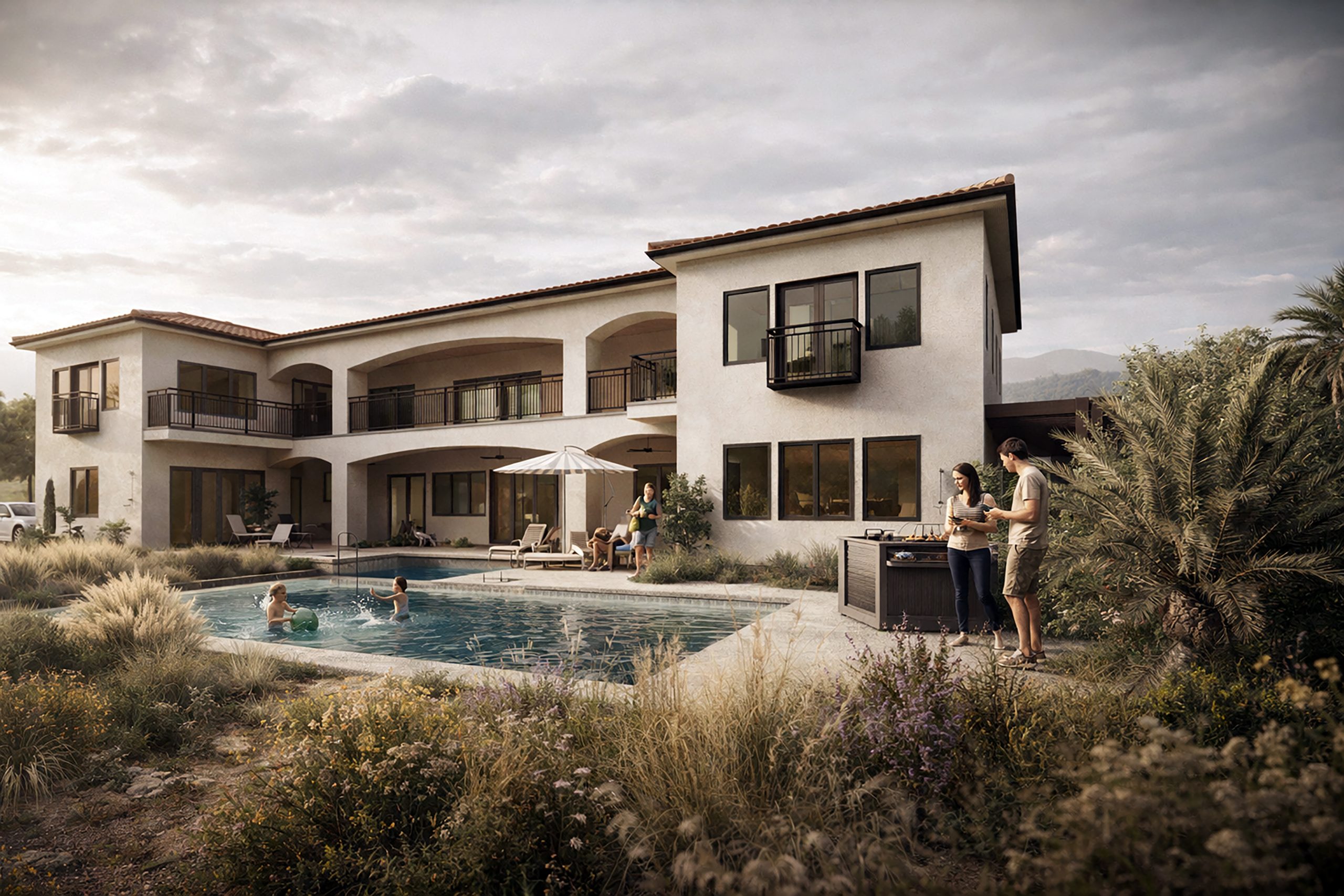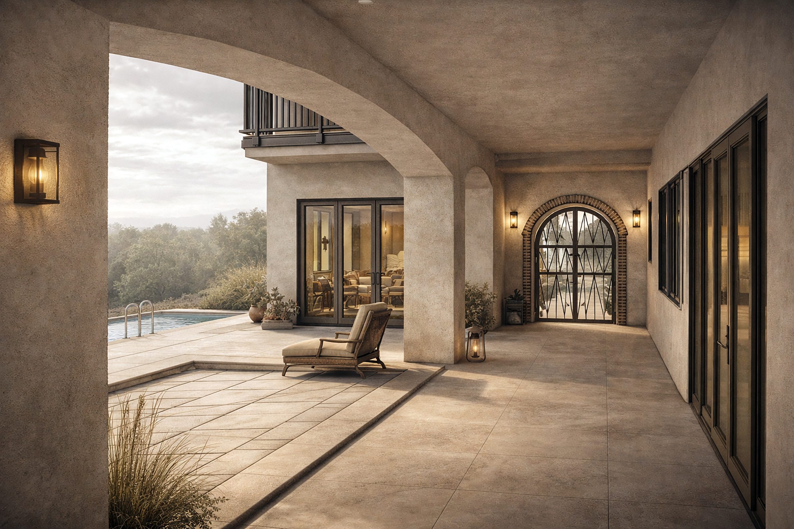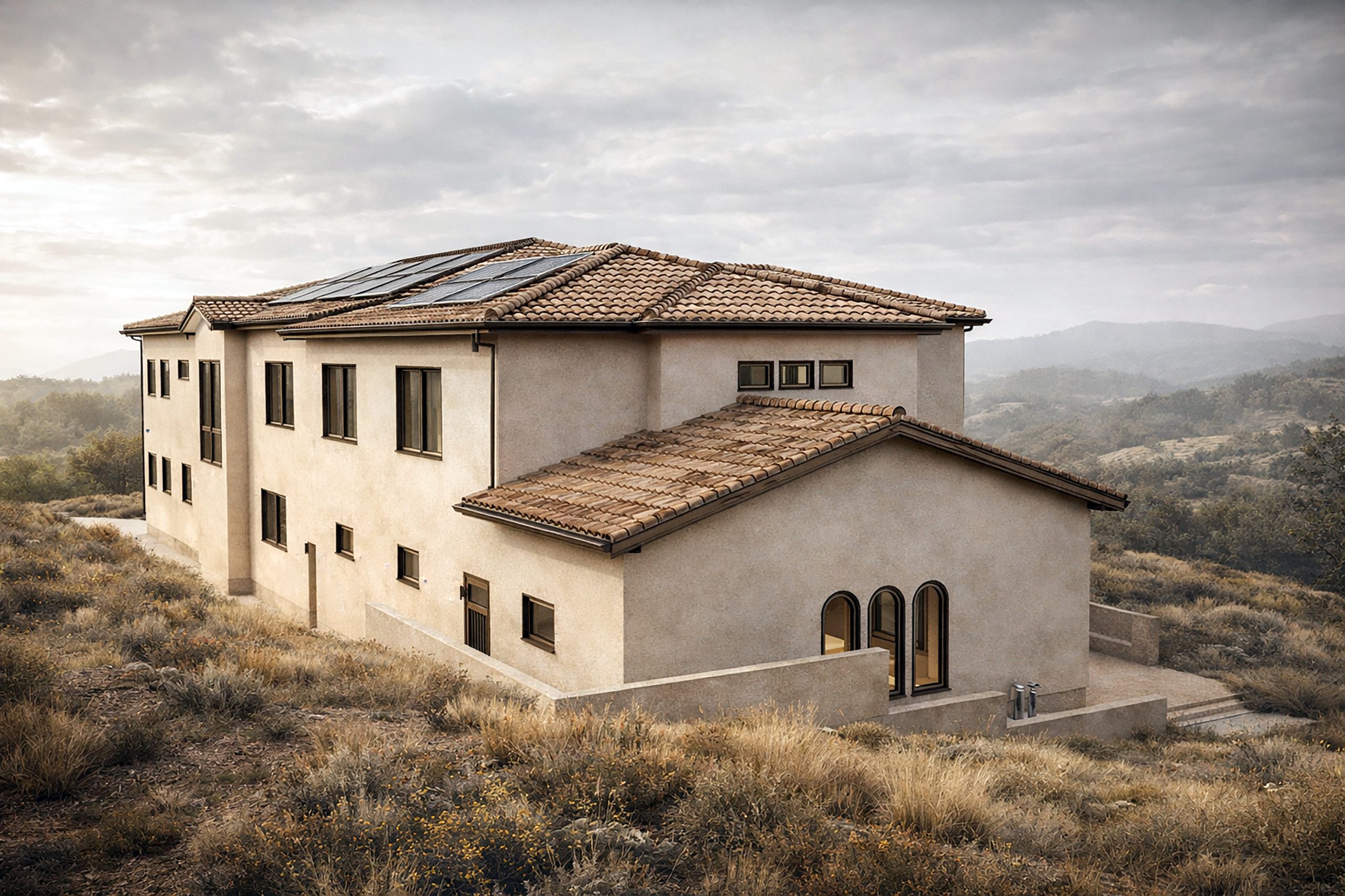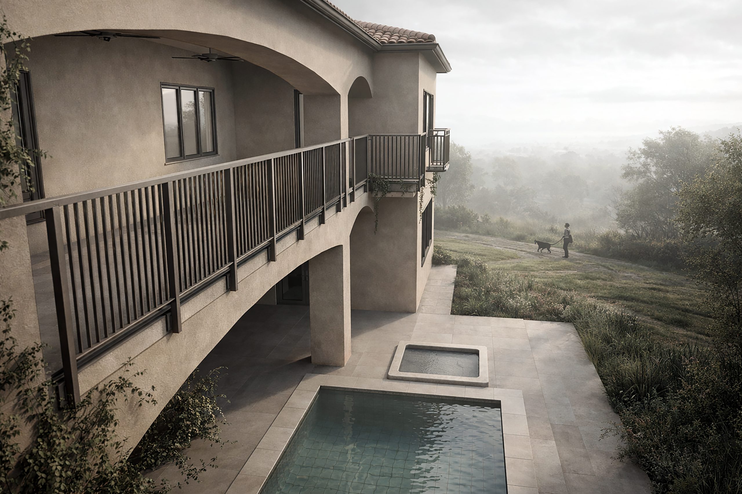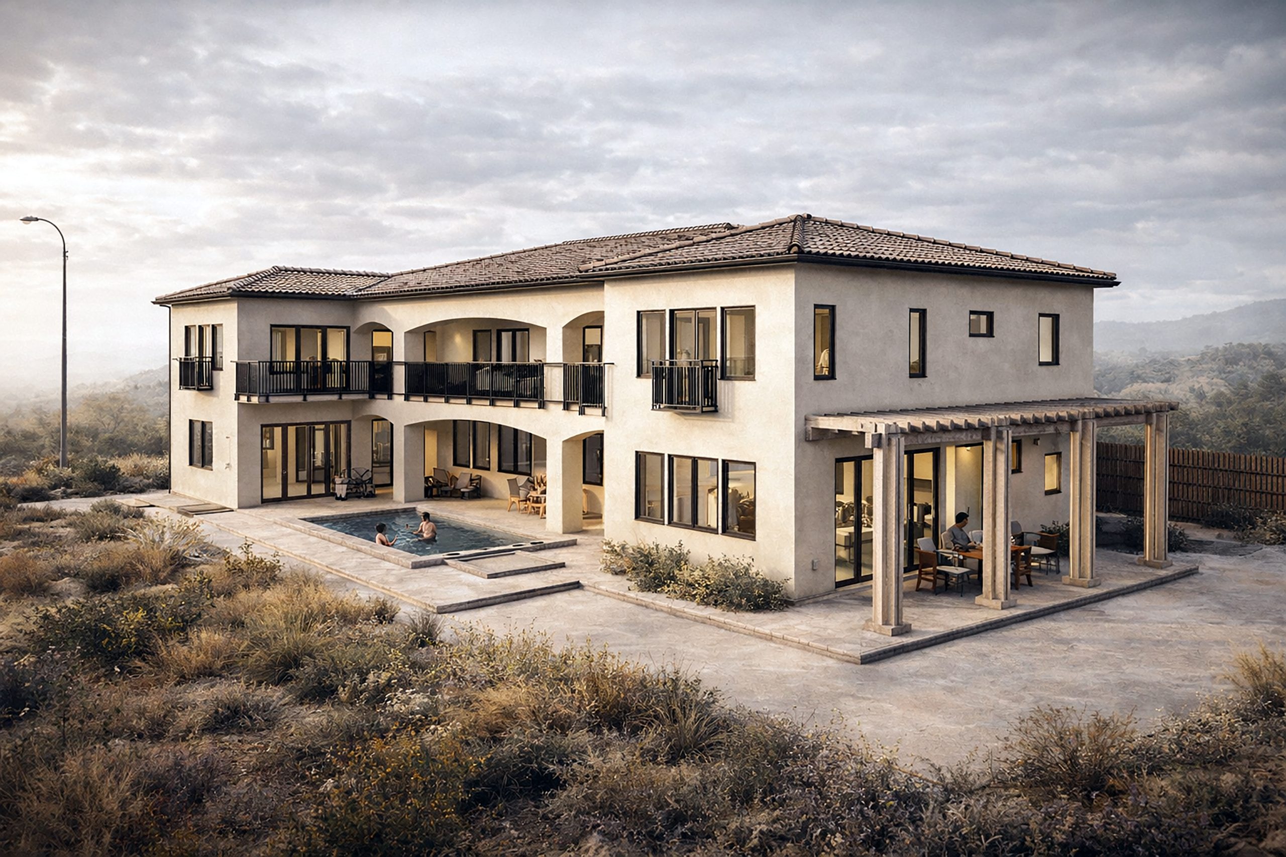We developed a Mediterranean-inspired transitional villa that blends timeless regional character with modern detailing. The design began with an ICF cast-in-place concrete structure for durability, thermal performance, and fire resistance. Smooth stucco finishes, terra-cotta tile roofing, and arched loggias establish Mediterranean warmth, while clean window groupings, steel balcony railings, and crisp lines introduce a contemporary balance.