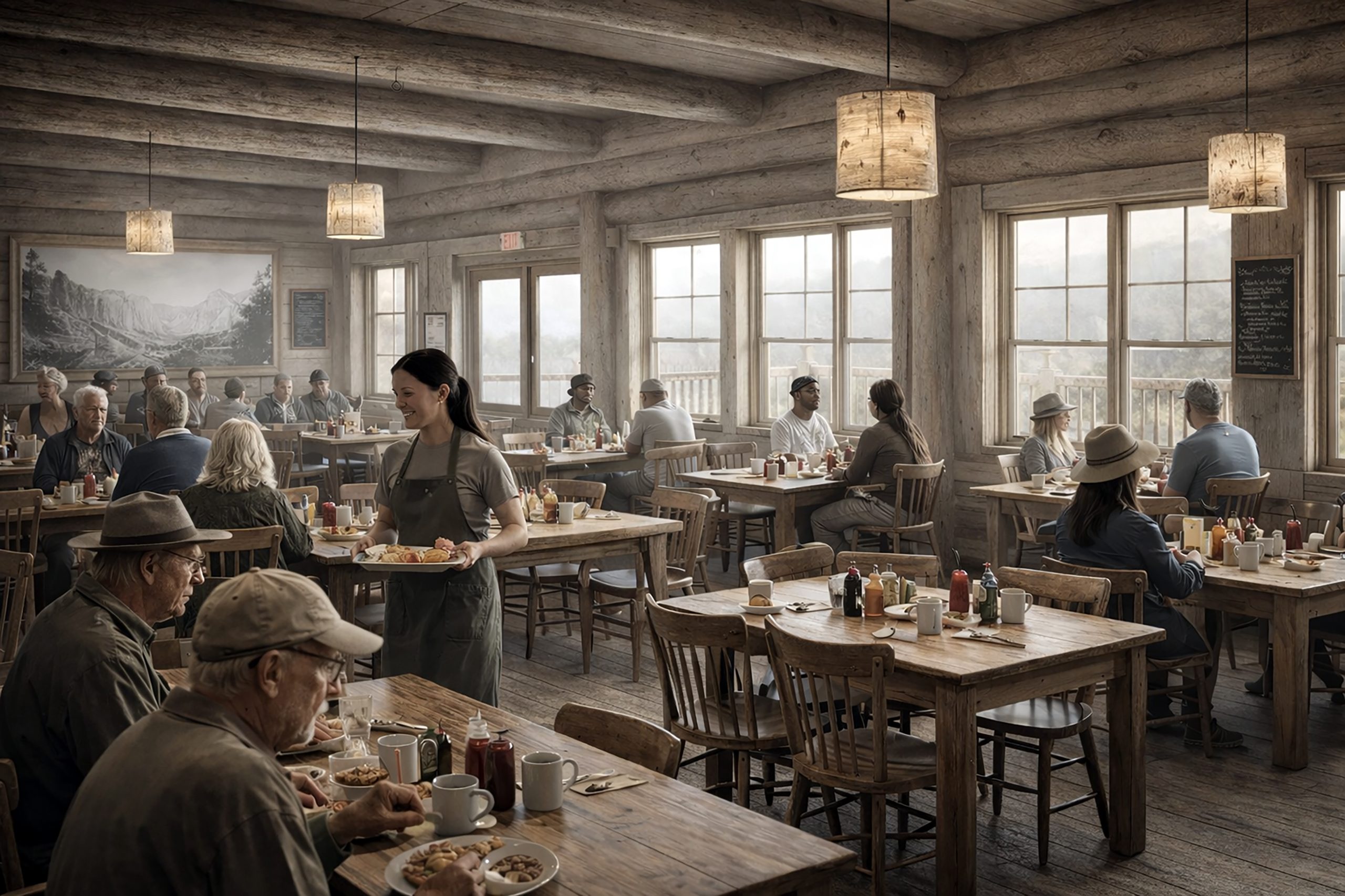 Coyote Springs Ranch was envisioned as a destination development positioned along a key route for travelers heading toward Yosemite National Park. The Trading Post was intended to serve as both a functional hub and a symbolic heart of the ranch, combining a mercantile, restaurant, and gathering space for visitors and residents alike. The challenge was to design a building that felt authentic to the historic trading posts of the Sierra foothills while meeting modern programmatic, structural, and code requirements. It needed to accommodate heavy seasonal tourist traffic, express craftsmanship and permanence, and integrate seamlessly with the broader ranch development, which included cabins, homes, and a church. Achieving this level of authenticity required a deep understanding of log and timber construction, as well as close coordination with regional suppliers and craftspeople.