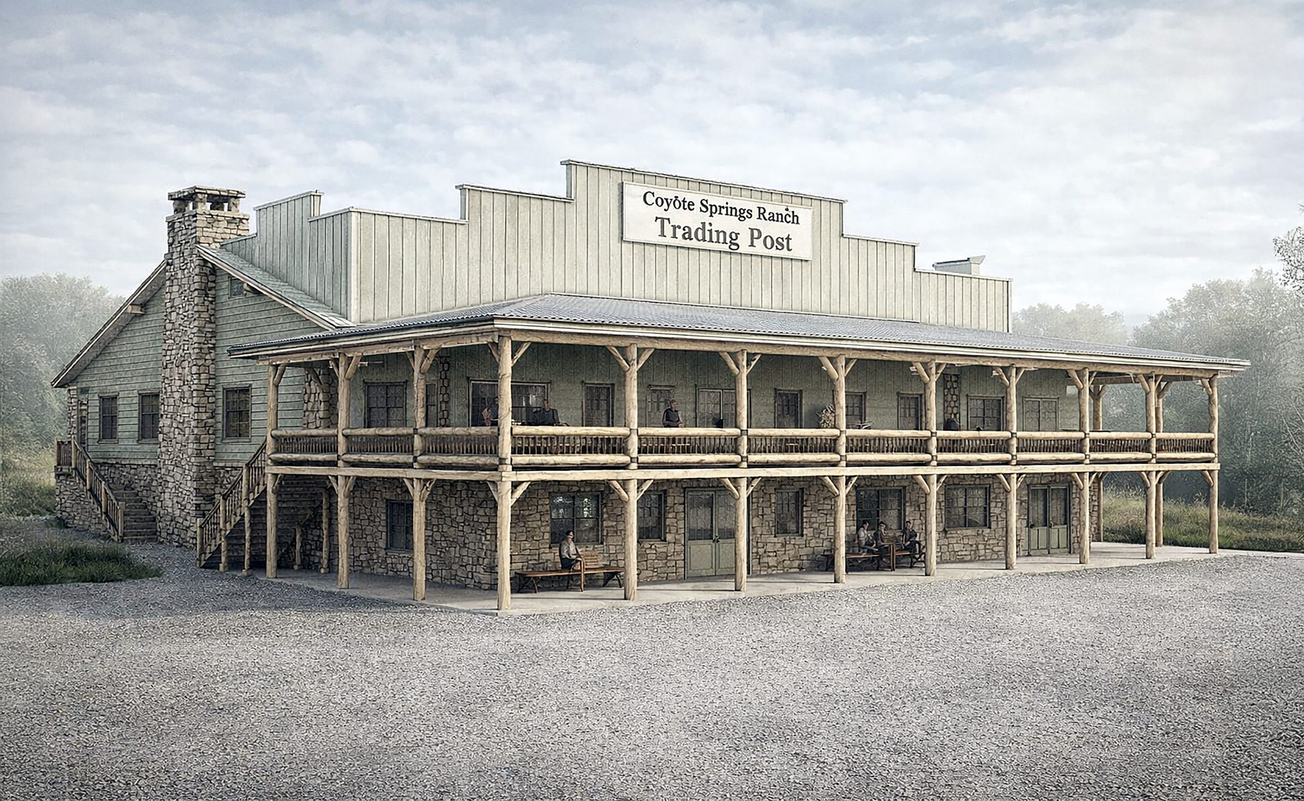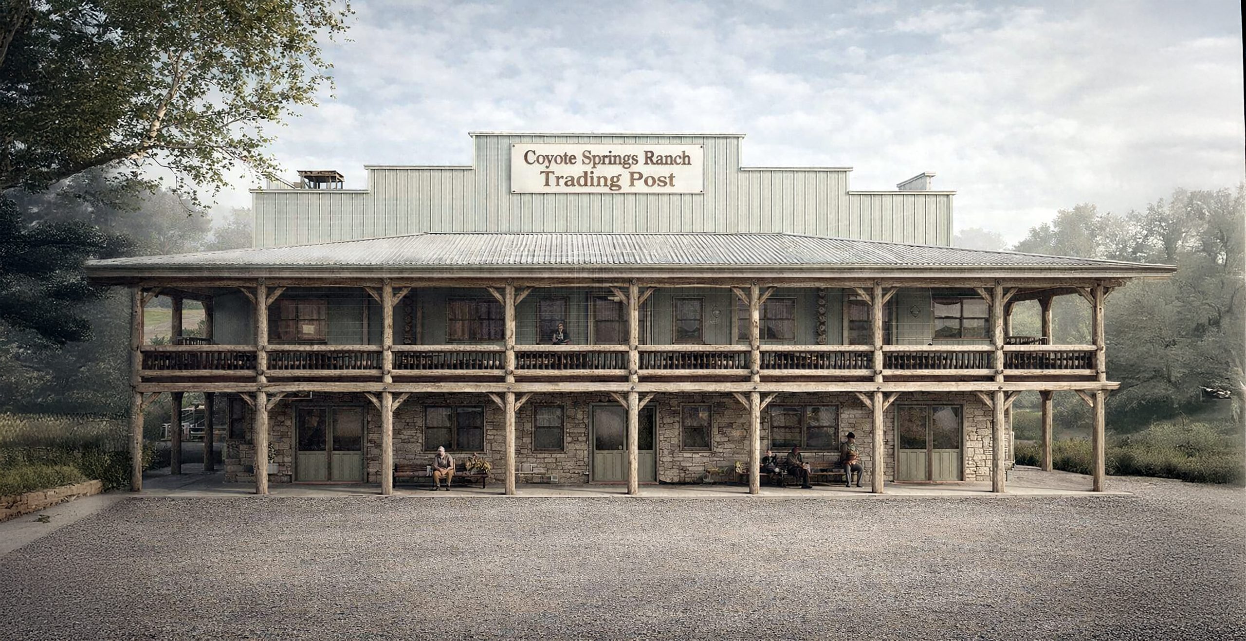 We designed the Trading Post as a two-story, porch-driven structure rooted in traditional Western and frontier architecture, expressed through a refined and intentional use of log, timber, and stone. Deep wraparound porches provide shade, weather protection, and places for informal gathering, reinforcing the building’s role as a social anchor within the ranch. The massing and roof forms reference historic mercantile buildings, while stepped parapets and simple signage establish a clear identity visible from a distance. A locally sourced log and timber system was central to the design. Working closely with a regional log supplier, we developed column spacing, beam sizing, railing systems, and connection details that balanced structural performance with visual authenticity. This collaboration allowed the architecture to express honest construction, with exposed log columns, heavy timber beams, and stone bases grounding the building in its landscape. Interior spaces were organized to support both retail and dining functions, with the restaurant designed as a warm, communal environment. Exposed log ceilings, wood floors, and large windows create a welcoming atmosphere that connects patrons to the surrounding hills and porches beyond. Circulation between interior and exterior spaces is intuitive, allowing the building to flex between peak tourist seasons and quieter periods without losing its sense of scale or purpose. RESULT The Coyote Springs Ranch Trading Post serves as a recognizable landmark and gathering place for visitors traveling to and from Yosemite National Park. Through careful proportion, material authenticity, and close collaboration with local timber suppliers, the building achieves a sense of timelessness and credibility that resonates with its setting. It functions successfully as both a mercantile and restaurant while anchoring the larger ranch development with a strong architectural identity. The result is a durable, welcoming structure that reflects regional traditions, supports tourism, and reinforces the client’s vision for a cohesive and authentic destination.